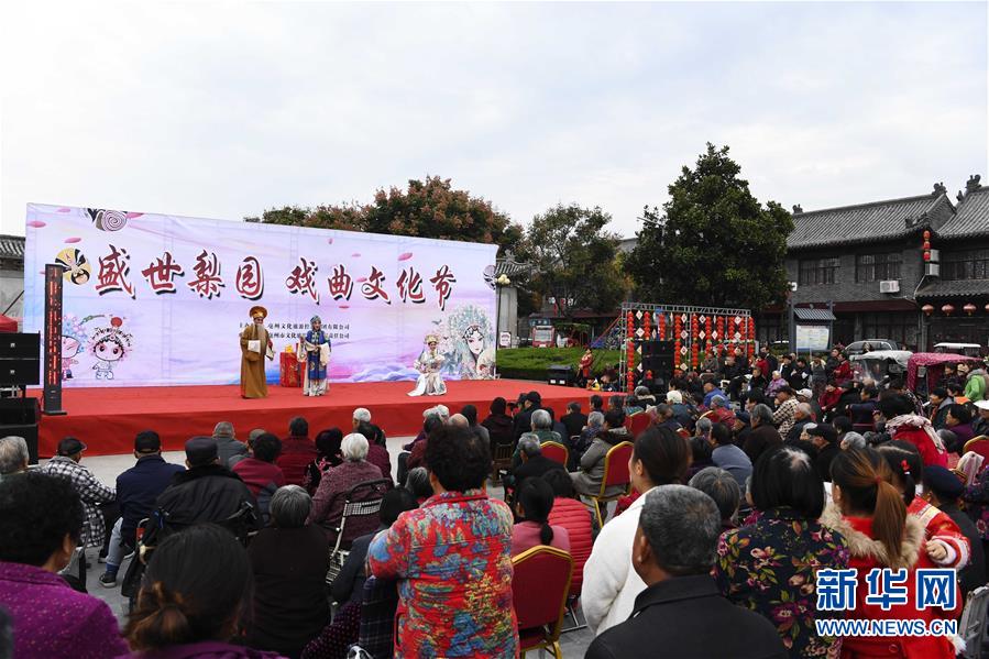 11月10日,在安徽省亳州市花戏楼广场,演员在表演《穆桂英挂帅》选段。新华社发(刘勤利 摄)