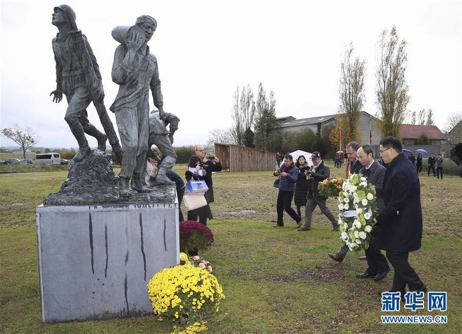 11月10日,在在比利时西佛兰德省波珀灵厄市华工雕像园,中国驻比利时大使曹忠明(右二)、波珀灵厄市市长克里斯托弗·德雅盖(右三)等向华工雕像敬献花圈。 中国驻比利时大使馆10日在比利时西佛兰德省波珀灵厄市华工雕像园举办活动,缅怀第一次世界大战中为欧洲和平做出非凡贡献的中国劳工。 新华社记者 叶平凡 摄