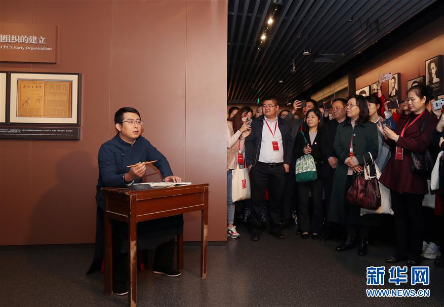 11月13日,代表们观看情景党课上展现的陈望道在家乡翻译《共产党宣言》的情景。 当日,情景党课《初心与使命》在上海中共一大会址纪念馆开讲,来自全国各地30多家红色场馆的代表聆听党课。 新华社记者 刘颖 摄