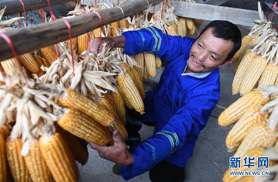 11月14日,在广西龙胜各族自治县泗水乡八滩村,侯光祖的父亲王成建在晾晒玉米。 新华社记者 陆波岸 摄