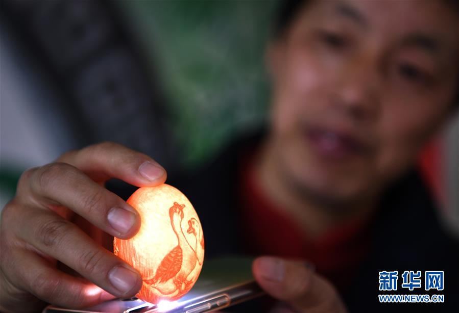 11月14日,王剑在工作室展示蛋雕作品。 新华社记者张端摄