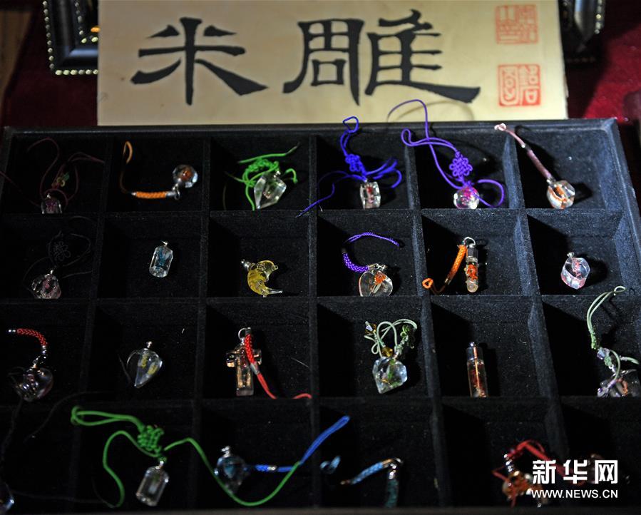 这是11月18日在沈阳市玖伍文化城拍摄的米雕作品。 近日,一场非物质文化遗产集中展示活动在沈阳市玖伍文化城举行,包括满族剪纸、米雕等非遗产品集中亮相,吸引众多观众驻足观赏,感悟非遗的魅力。 新华社记者 杨青摄