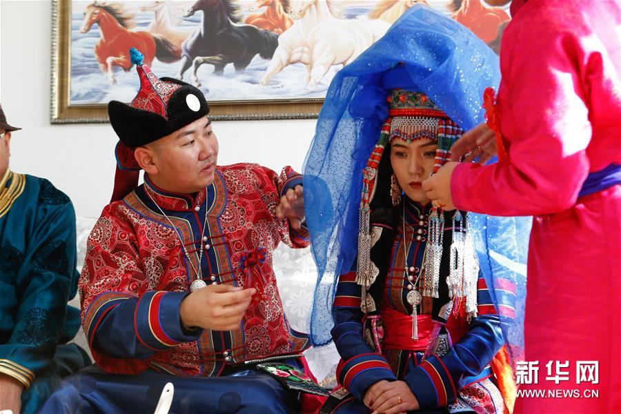 11月17日,在内蒙古鄂尔多斯市鄂托克前旗乌提嘎查,新郎那音巴图为新娘乌云塔娜掀开盖头。 “鄂尔多斯婚礼”是内蒙古鄂尔多斯地区传统民俗,形成于蒙元时期,至今已流传700多年,目前仍然比较完整地保留着鄂尔多斯婚礼的哈达定亲、佩弓娶亲、献羊祝酒等程序。婚礼通过优美的歌舞和隆重的仪式,表达对美好生活的追求。2006年,“鄂尔多斯婚礼”被列入国家级非物质文化遗产名录。 新华社记者虞东升摄