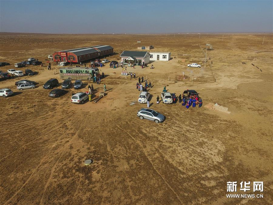 11月17日,在内蒙古鄂尔多斯市鄂托克前旗乌提嘎查,男方家属迎接乘车抵达的新娘(无人机航拍)。 “鄂尔多斯婚礼”是内蒙古鄂尔多斯地区传统民俗,形成于蒙元时期,至今已流传700多年,目前仍然比较完整地保留着鄂尔多斯婚礼的哈达定亲、佩弓娶亲、献羊祝酒等程序。婚礼通过优美的歌舞和隆重的仪式,表达对美好生活的追求。2006年,“鄂尔多斯婚礼”被列入国家级非物质文化遗产名录。 新华社记者刘磊摄