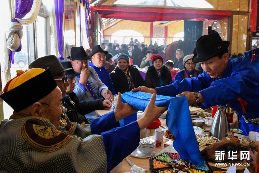 11月17日,在内蒙古鄂尔多斯市鄂托克前旗乌提嘎查,新娘亲属代表给新郎亲属献哈达。 “鄂尔多斯婚礼”是内蒙古鄂尔多斯地区传统民俗,形成于蒙元时期,至今已流传700多年,目前仍然比较完整地保留着鄂尔多斯婚礼的哈达定亲、佩弓娶亲、献羊祝酒等程序。婚礼通过优美的歌舞和隆重的仪式,表达对美好生活的追求。2006年,“鄂尔多斯婚礼”被列入国家级非物质文化遗产名录。 新华社记者刘磊摄