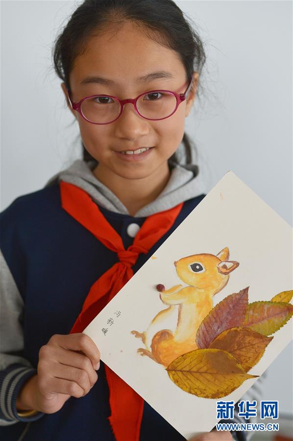 11月19日,山东省青岛市实验小学学生展示完成的树叶画作品。 新华社发(王海滨 摄)