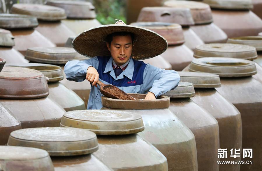 11月18日,在贵州省赤水市一家醋厂,工人在查看醋醅发酵情况。 “赤水晒醋”历史悠久,这种古法酿醋技艺以当地优质大米、糯米、纯中药制作醋曲,经过蒸煮、酿晒、发酵等30余道工序制作而成,2009年被列入贵州省级非遗名录。 新华社发(王长育 摄)