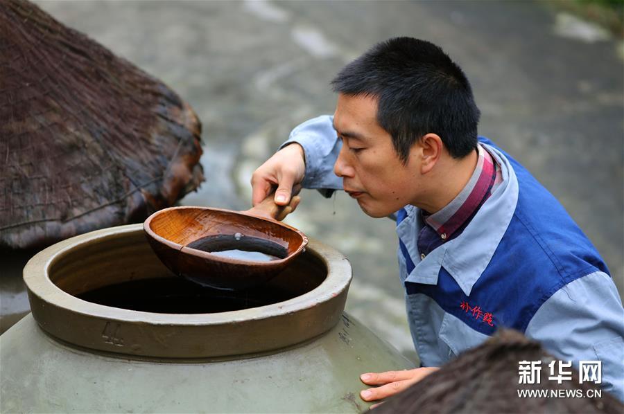 11月18日,在贵州省赤水市一家醋厂,工人在检验晒醋质量。 “赤水晒醋”历史悠久,这种古法酿醋技艺以当地优质大米、糯米、纯中药制作醋曲,经过蒸煮、酿晒、发酵等30余道工序制作而成,2009年被列入贵州省级非遗名录。 新华社发(王长育 摄)
