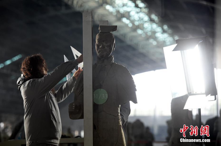 工作人员在位于西安市临潼县的秦始皇陵兵马俑一号坑内对兵马俑进行考察。当天,“2018寰行中国 别克·中国文化之旅”从陕西省西安市启程,在前往江苏省南京市的旅程中探访沿途的人文风情。中新社记者 侯宇 摄