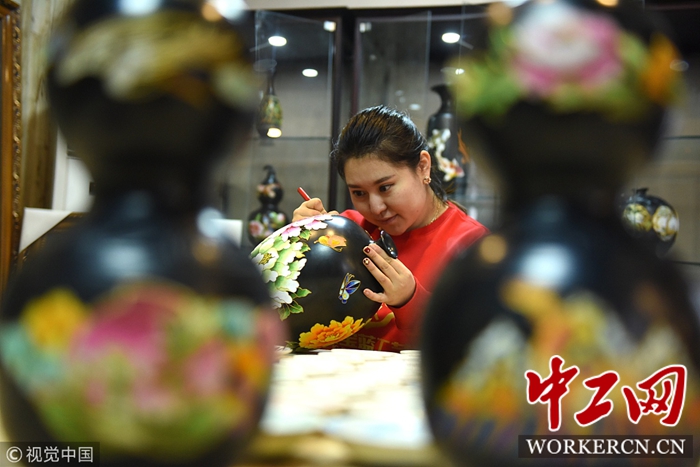 2018年1月2日,山东临沂,于文婷在制作景泰蓝黑陶彩釉瓶。