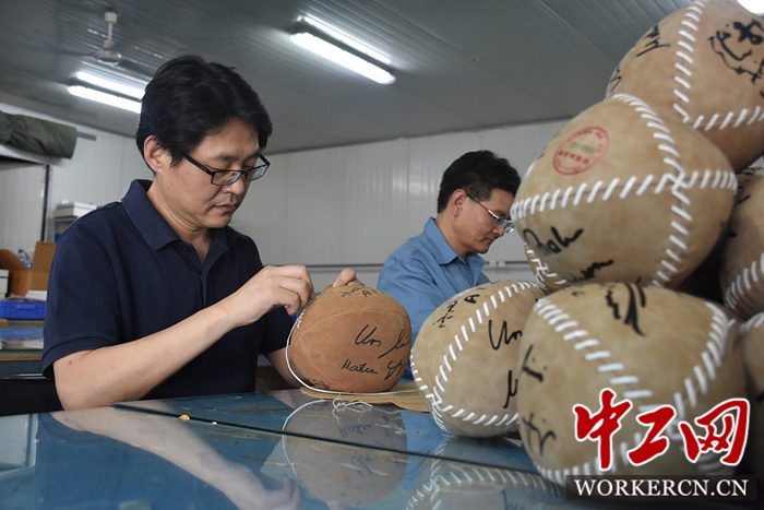 2018年6月23日,在山东淄博, 60后的于剑对足球爱不释手。不同的是,他痴迷于中国古代足球蹴鞠。十多年来,于剑坚持纯手工制作蹴鞠,“线的拉扯回合需要力气,缝制更需要技巧。对蹴鞠的重量、圆度等都有明确标准,蹴鞠是个力气活、细致活、精品活,”于剑说。为了学习经营,他38岁那年还跟着年轻人一起考研。如今,他们做的蹴鞠卖到了全国乃至海外。