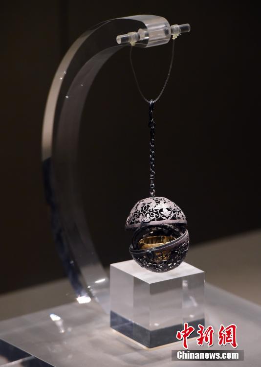 位于西安市的陕西历史博物馆内展示的唐代葡萄花鸟纹银香囊。中新社记者 侯宇 摄