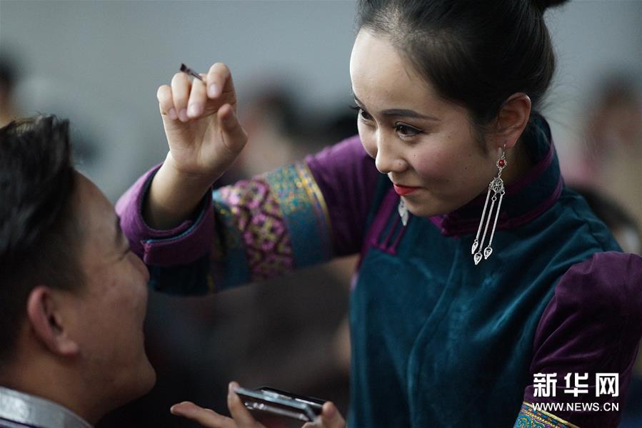 内蒙古苏尼特右旗乌兰牧骑队员在演出前化妆(1月27日摄)。 人民在哪里,哪里就是中心;生活在哪里,哪里就是舞台。60年一路走来,这支队伍与时俱进,不改初心,为促进草原文化繁荣发展、民族团结进步、边疆安宁稳定做出重要贡献。他们,有一个共同的名字——乌兰牧骑。 新华社发(东哈达摄)