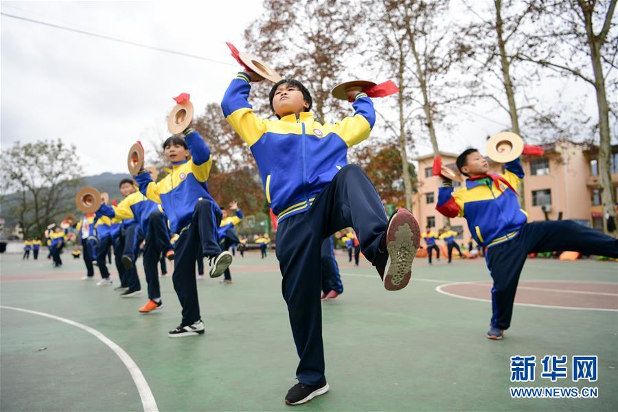 11月20日,在湖北恩施来凤县旧司镇中心小学,学生们在练习击打伴乐乐器。 近年来,湖北省恩施土家族苗族自治州来凤县旧司镇中心小学将国家级非物质文化遗产“地龙灯”引入校园进行推广,引导孩子们学习传统文化,体验传统文化的魅力。 新华社发(唐俊 摄)