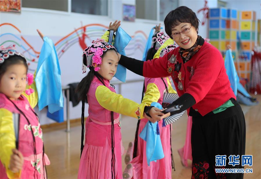 11月21日,京剧演员陈荣段(右)在衡水市滏阳小学指导学生练习京剧人物造型。 近年来,河北省衡水市滏阳小学积极开展京剧文化进校园活动,将京剧课程引入第二课堂,通过京剧展演、京剧名家进课堂、京剧社团交流等活动形式,让学生们近距离感受传统国粹文化的魅力。 新华社记者 朱旭东 摄