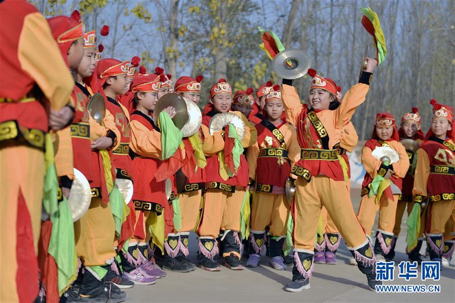 11月21日,河北省邢台市桥东区长信小学学生张榆茉(右一)练习打钹。 今年以来,河北省邢台市桥东区长信小学将当地民间音乐“长信排鼓”引入校园,开设校本课程,聘请民间艺人为学生授课,在丰富校园文化生活的同时,弘扬和传承中国传统文化。 “长信排鼓”是集体表演项目,表演器具以鼓、锣、钹为主。表演者身着古战服,按阵形排开,大鼓指挥,小锣引导。表演者随着鼓点变化,不断变换队形。2007年6月,“长信排鼓”被河北省列为省级非物质文化遗产。 新华社发(陈雷 摄)