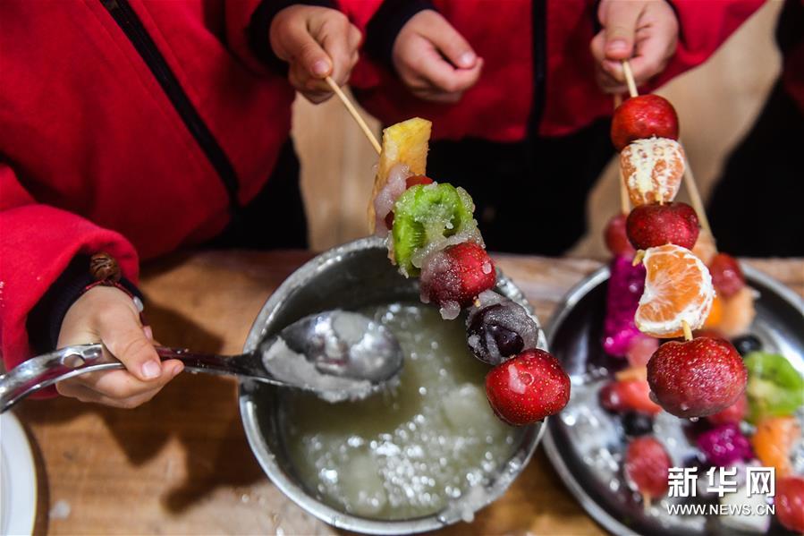 11月21日,孩子们在老师的带领下用桔子、山楂等水果制作糖葫芦。 在小雪节气即将到来前,浙江省长兴县李家巷镇中心幼儿园的孩子们在老师的带领下,用大米、糯米、玉米、南瓜、赤豆、咸鸭蛋等农产品亲手制作竹筒饭、八宝糕、糯米团、糖葫芦等,让孩子们在制作传统美食的过程中了解节气文化,在欢乐的气氛中迎接小雪节气的到来。 新华社记者 徐昱 摄