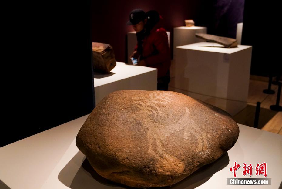 11月21日,“美在阿拉善—岩画与居延汉简艺术展”开幕式在北京中国美术馆举行,共展出岩画实物、雕塑、拓片、汉简等共计100多件。图为铁器时代岩画《鹿》。中新社记者 杜洋 摄
