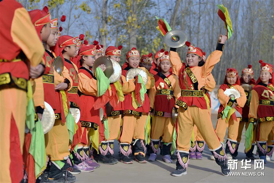 11月21日,河北省邢台市桥东区长信小学学生张榆茉(右一)练习打钹。 今年以来,河北省邢台市桥东区长信小学将当地民间音乐“长信排鼓”引入校园,开设校本课程,聘请民间艺人为学生授课,在丰富校园文化生活的同时,弘扬和传承中国传统文化。 “长信排鼓”是集体表演项目,表演器具以鼓、锣、钹为主。表演者身着古战服,按阵形排开,大鼓指挥,小锣引导。表演者随着鼓点变化,不断变换队形。2007年6月,“长信排鼓”被河北省列为省级非物质文化遗产。 新华社发(陈雷 摄)