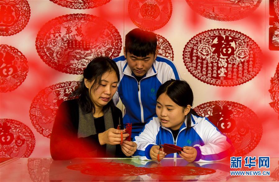 11月23日,衡水市冀州区职教中心学生在剪纸艺人的指导下学习市级非物质文化遗产“宫廷剪纸”。 近年来,为了弘扬传统文化、传承民间艺术,河北省衡水市冀州区在多所中小学实施“非遗文化进课堂”工程,走出一条特色素质教育之路。 新华社记者 李晓果 摄