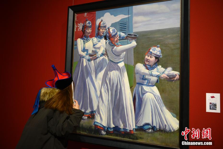 11月23日,观众欣赏油画作品《草原上的白云》。近日,“弘扬乌兰牧骑精神--内蒙古乌兰牧骑主题美术作品展览”在位于呼和浩特市的内蒙古美术馆开幕。中新社记者 刘文华 摄