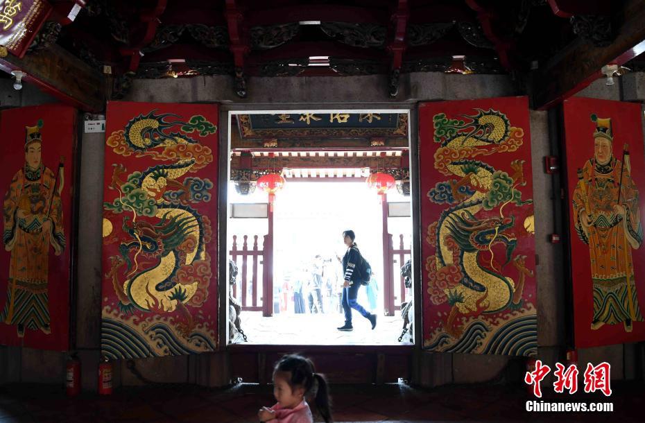 信众和游客在白礁慈济宫游览。在全国所有地方的庙宇中,只有慈济宫前殿大门画着太监图案,是全国罕见的门饰。张斌 摄