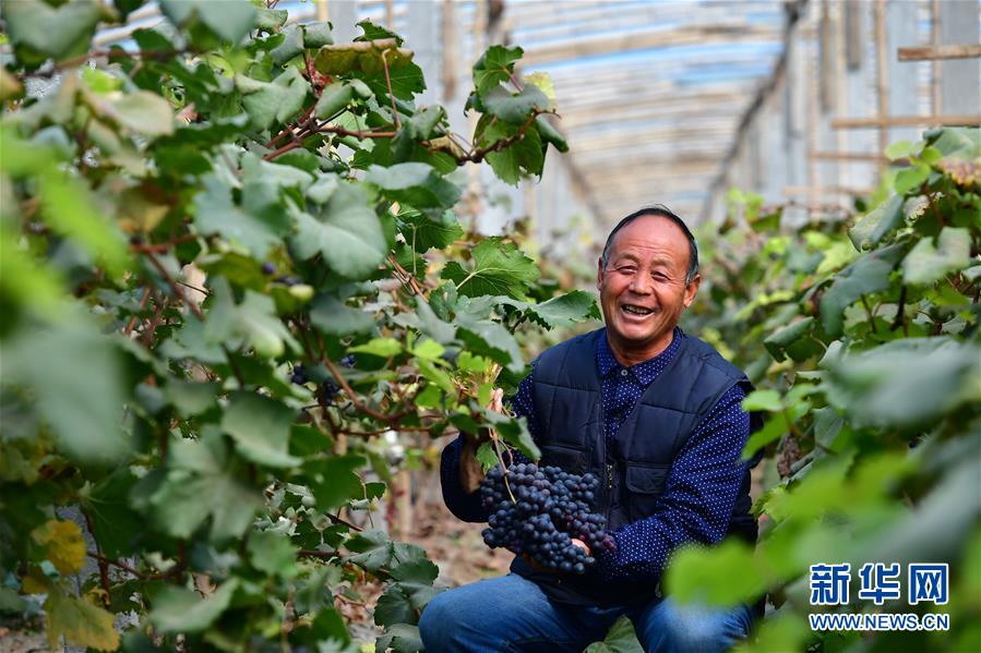 在兰考葡萄架乡黄砦村,一位村民展示温室中的葡萄(11月12日摄)。 新华社记者 冯大鹏 摄