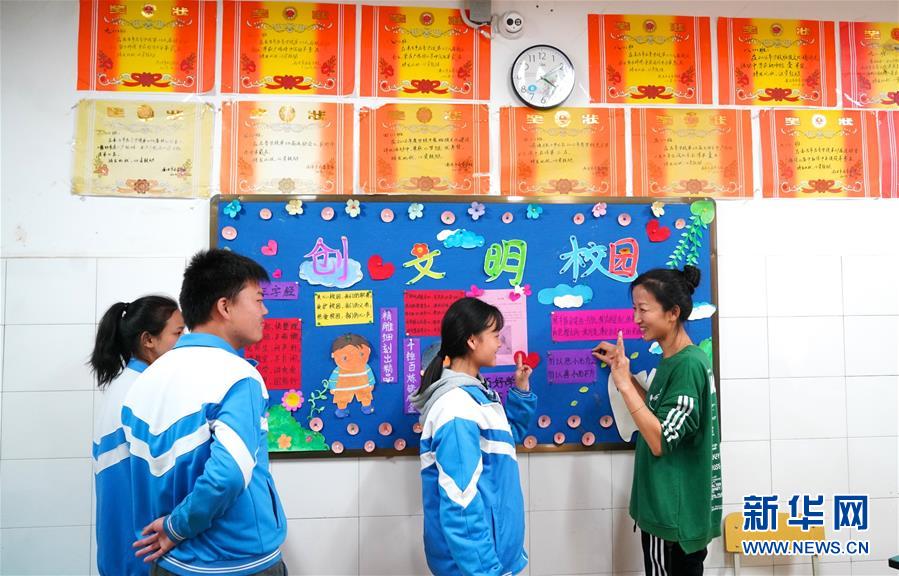 11月26日,曾文萍(右)在学校和学生一起准备最新一期的墙报。