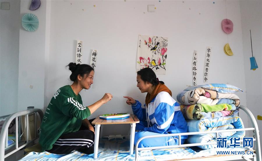 11月26日,曾文萍(左)和学生在寝室内下跳棋。