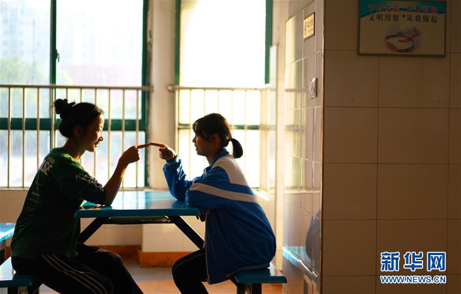 11月26日,曾文萍(左)在学校的食堂安慰一名心情低落的学生。