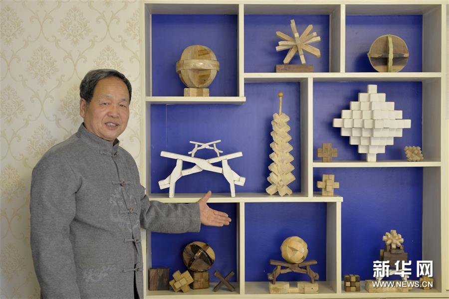 11月28日,侯全辰展示自己制作的部分孔明锁。 侯全辰是河北省沙河市一位七旬退休老人。年少时,他向当地一位民间艺人学习孔明锁制作技艺,从此迷上了孔明锁制作。退休后,他投入大量的精力到孔明锁的研发制作上,并且把这一技艺向当地居民推广。目前,他已研发制作出球形锁、宝塔锁、多米锁等120多种孔明锁。 新华社发(田晓丽 摄)