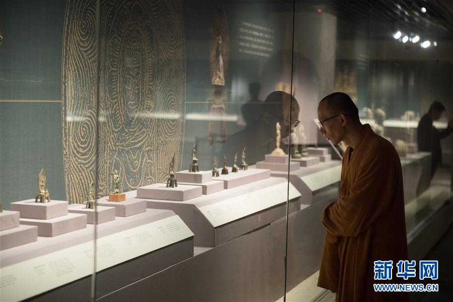 11月29日,一名僧人在观看佛教造像。 新华社记者翁忻旸摄