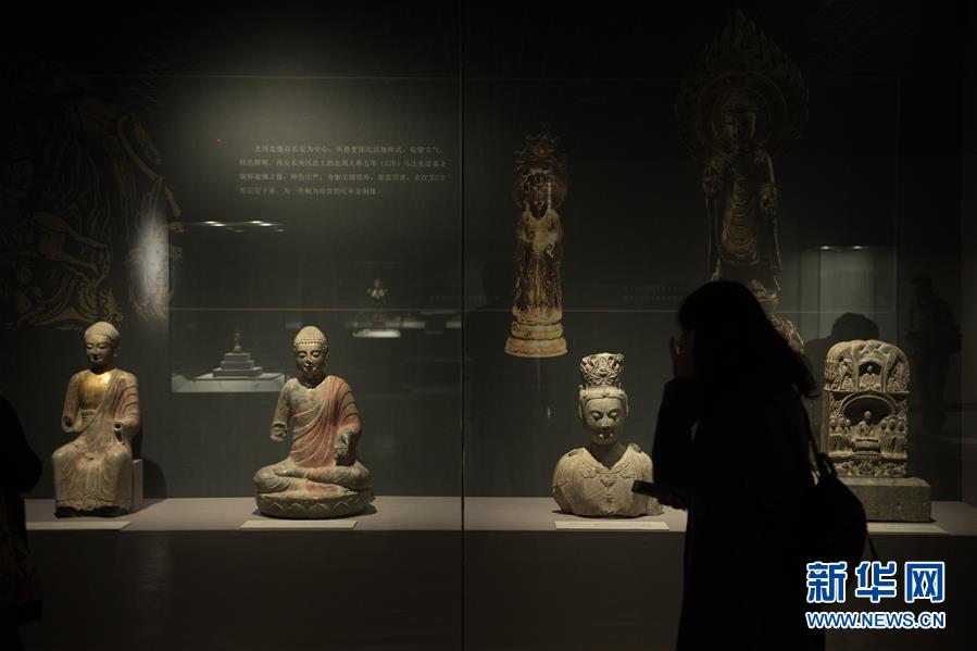 11月29日,观众从展出的一组石雕造像前走过。 新华社记者翁忻旸摄