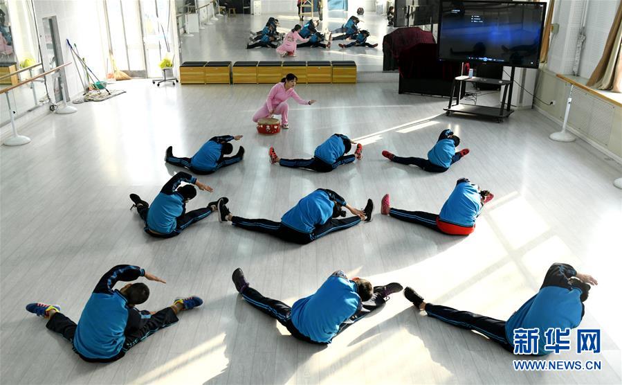 11月29日,在石家庄市特殊教育学校,特教舞蹈老师赵钰带领学生们进行热身训练。