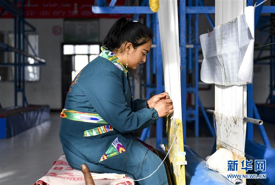 在新疆纳克西湾手工地毯开发有限公司生产车间内,工人美合日妮萨·麦麦提敏在编织地毯(11月20日摄)。 新疆和田地区有着手工编织地毯的悠久历史,闻名中外。如今,依靠政府主导、援疆省市助力、乡村能人领头,这门传统手艺开启了当地农牧民致富增收的新途径。 新华社记者 马锴 摄