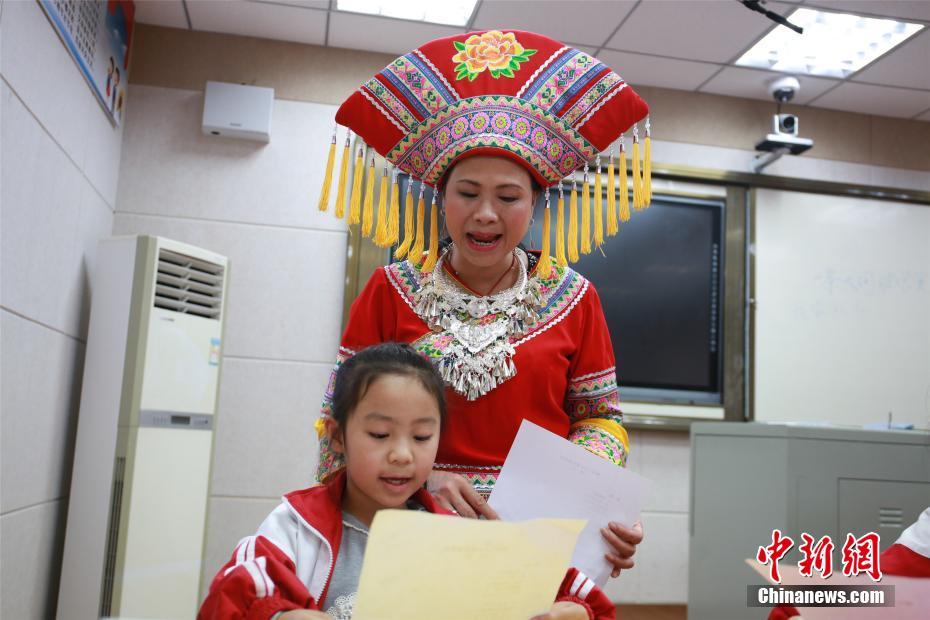 12月3日,在广西柳州市柳石路第二小学,30名小学生跟着广西山歌歌王陆连芳学唱山歌,校园里嘹亮悦耳的山歌此起彼伏。作为广西壮族自治区非物质文化遗产“鱼峰歌圩”代表性传承人的陆连芳,自2014年起,走进校园“开课”,教授小学生唱山歌、编山歌等,以此传承山歌文化。目前,陆莲芳在三所学校教授山歌,培养了一批山歌爱好者。图为陆连芳和学生一起唱山歌。 朱柳融 摄