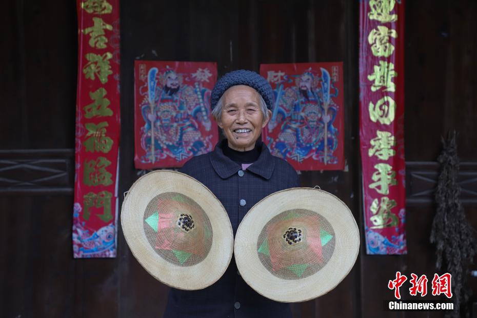 12月3日,宋尔凤老人展示已经编织完成的斗笠。1940年出生的宋尔凤老人是贵州省铜仁市思南县塘头镇红旗村“塘头棕丝斗笠”制作工艺的传承人,她从小就开始学习斗笠制作,现年78岁的她依旧坚持用“细如发丝”的竹子编织斗笠。“塘头棕丝斗笠”制作历史久远,明朝时期就已成为贡品。制作斗笠需要经过选竹、切丝、揉丝、分层、打磨、编织等工序,做工极为精细。 中新社记者 瞿宏伦 摄