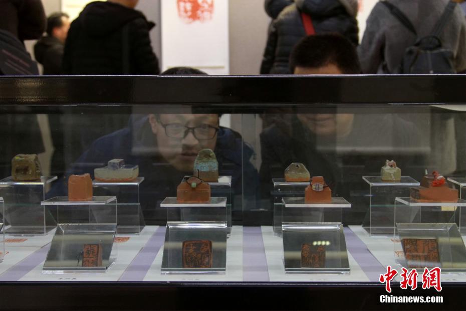 12月4日,两位参观者正在观看印刻展品。当日,“丝路遗风”黄土陶瓷印刻作品展在西宁开展。本次展览共展出百余件黄土陶瓷印原创作品及印屏。中新社记者 李培源 摄