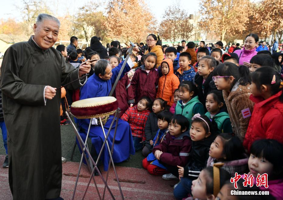 12月4日,河北石家庄宁源小学举行非物质文化遗产进校园活动。京东大鼓、井陉拉花等国家级非遗项目一一亮相,高粱秸秆工艺、无极剪纸、锔刻瓷技艺等十余个传统民间手工艺项目的传承人带着自己的作品与孩子们面对面交流。图为孩子们认真地听京东大鼓。中新社记者 翟羽佳 摄