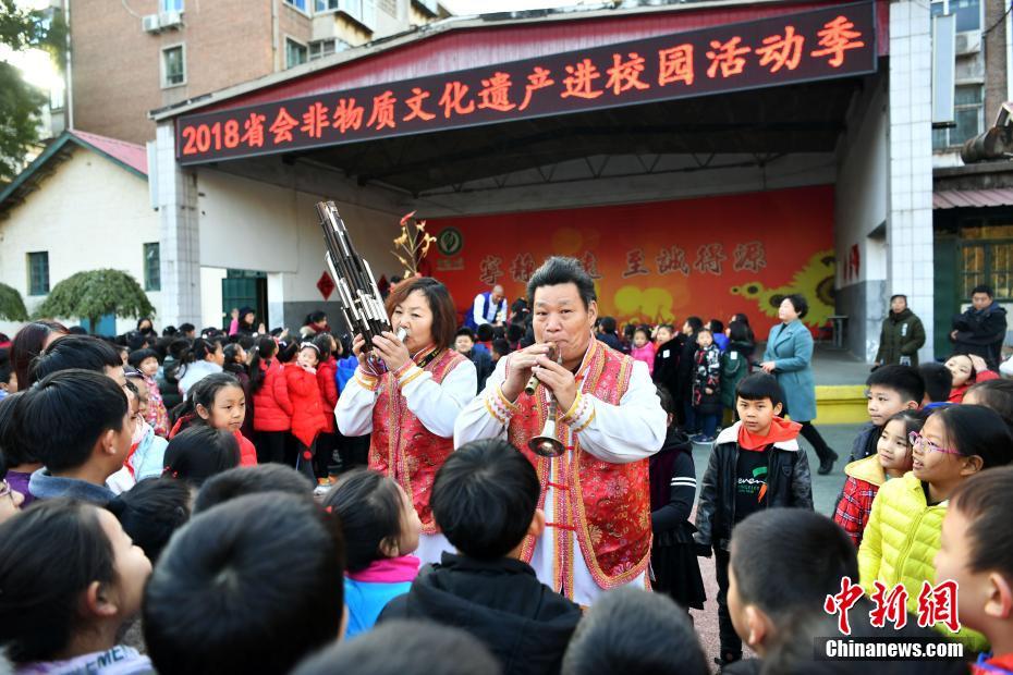 12月4日,河北石家庄宁源小学举行非物质文化遗产进校园活动。京东大鼓、井陉拉花等国家级非遗项目一一亮相,高粱秸秆工艺、无极剪纸、锔刻瓷技艺等十余个传统民间手工艺项目的传承人带着自己的作品与孩子们面对面交流。图为学生们关注非遗传承人表演。中新社记者 翟羽佳 摄