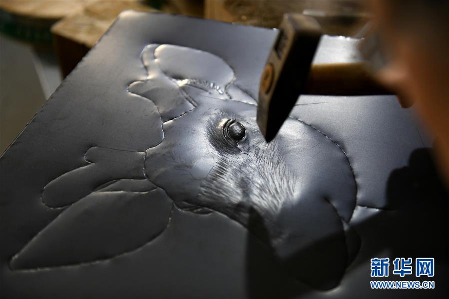 12月4日,在位于石家庄市德明古镇的工作室,郭海龙制作铁板浮雕作品。