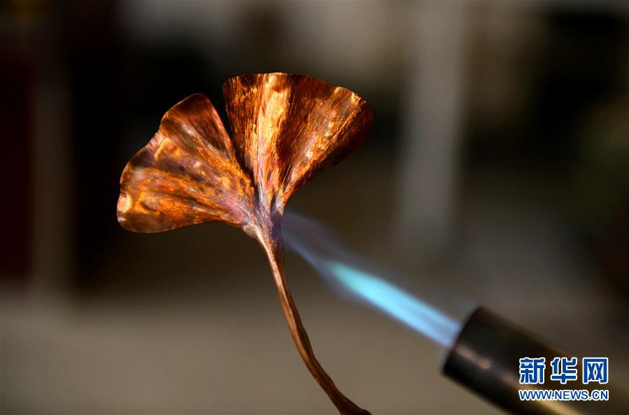 12月4日,在位于石家庄市德明古镇的工作室,郭海龙为铁板浮雕银杏叶作品进行烧色工艺处理。