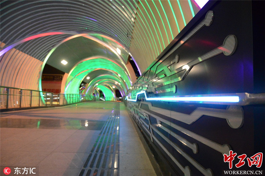 2018年12月4日,北京,中关村大街已使用近10年、连接科贸大厦和海龙大厦的中关村大街人行天桥“时空隧道”即将完工向市民开放投用,钢结构部分安装了环保节能的LED灯,夜晚可以进行景观照明,星星点点的灯光,营造出“时空隧道”的穿越感。