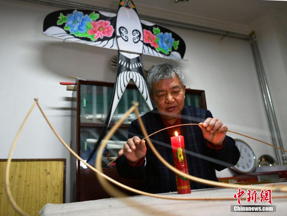 12月5日,付宪明在河北石家庄家中“烤制”做风筝的骨架。据了解,这对六旬夫妇痴迷风筝已有20年,1998年至今他们一共制作了1500多个风筝。这些手工风筝种类各异、形态万千、富有特色,都是付宪明通过刻苦自学、不断摸索制作而成的。如今,夫妇俩希望再多做一些风筝,有更多的人学习风筝制作,将此手艺传承下去。图为付宪明拼装并介绍风筝制作过程。中新社记者 翟羽佳 摄