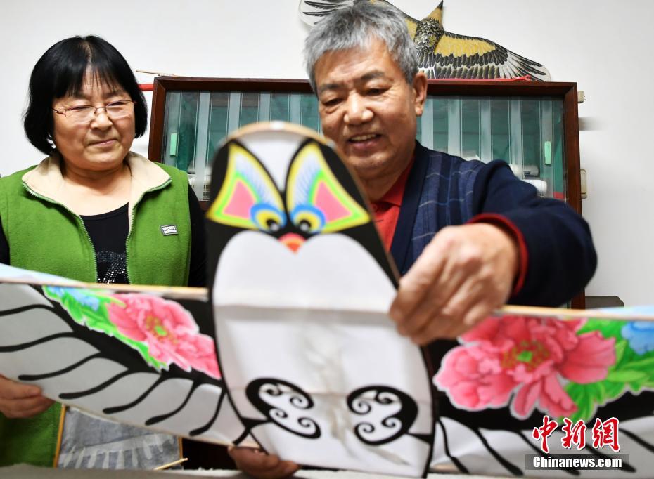 12月5日,在河北石家庄付宪明家中,他和老伴展示并介绍心爱的风筝。据了解,这对六旬夫妇痴迷风筝已有20年,1998年至今他们一共制作了1500多个风筝。这些手工风筝种类各异、形态万千、富有特色,都是付宪明通过刻苦自学、不断摸索制作而成的。如今,夫妇俩希望再多做一些风筝,有更多的人学习风筝制作,将此手艺传承下去。图为付宪明拼装并介绍风筝制作过程。中新社记者 翟羽佳 摄