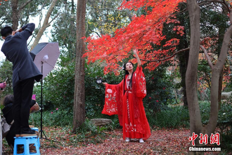 12月5日,南京紫金山红枫岗枝叶层叠,吸引了大批市民漫步其中,欣赏多彩“枫”景。中新社记者 泱波 摄