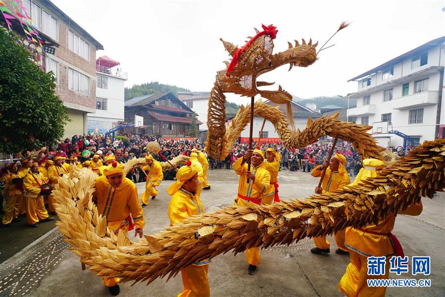12月7日,广西龙胜各族自治县平等镇广南村侗族同胞在舞草龙。 当日,广西龙胜各族自治县平等镇广南村侗族同胞身着民族盛装,开展民俗巡游、弹唱琵琶歌、舞草龙、吃百家宴等活动,载歌载舞欢庆侗年。 新华社发(黄勇丹 摄)