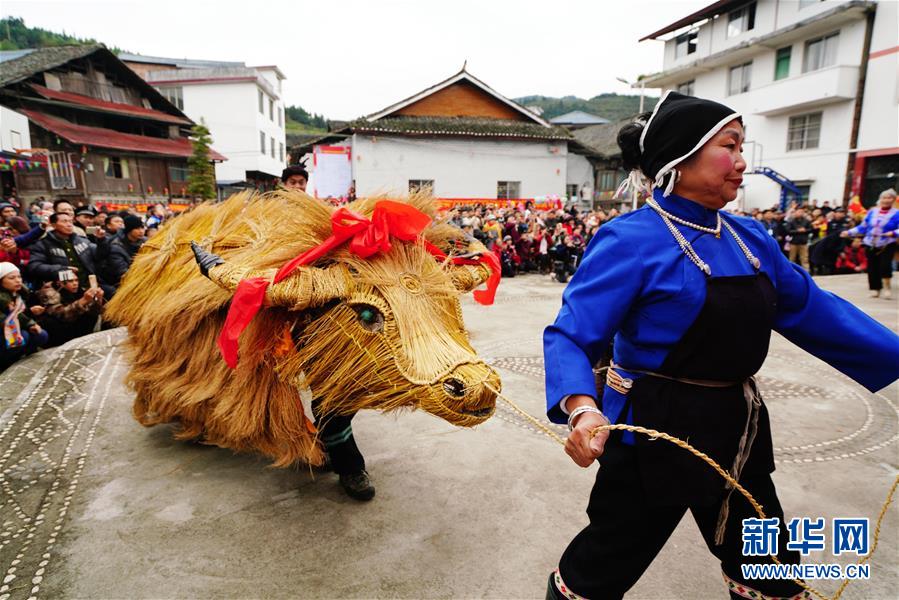 12月7日,广西龙胜各族自治县平等镇广南村侗族同胞在舞春牛。 当日,广西龙胜各族自治县平等镇广南村侗族同胞身着民族盛装,开展民俗巡游、弹唱琵琶歌、舞草龙、吃百家宴等活动,载歌载舞欢庆侗年。 新华社发(黄勇丹 摄)