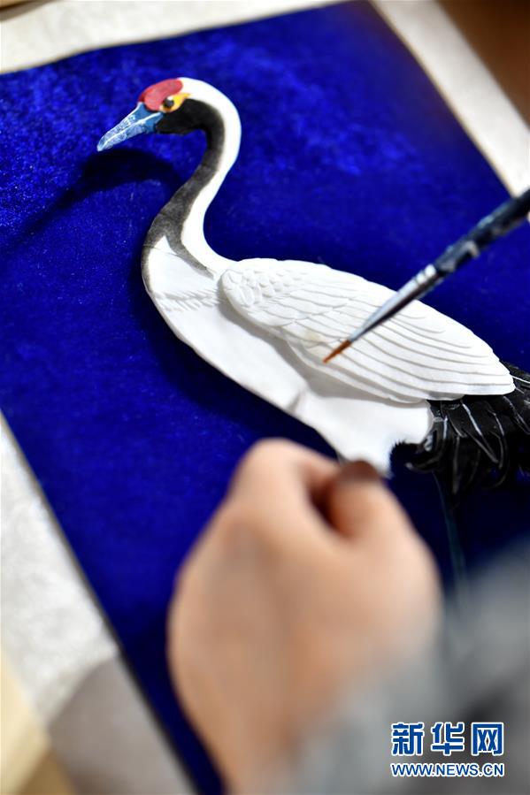 左惠平在其位于贵州省遵义市的工作室创作通草堆画《松鹤》(7月22日摄)。 新华社发(罗星汉 摄)