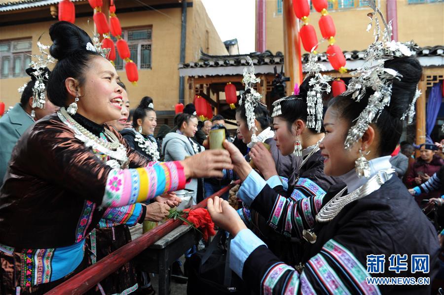 12月9日,贵州省黎平县中潮镇佳所侗寨的村民在拦门敬酒。 新华社发(杨文斌 摄)